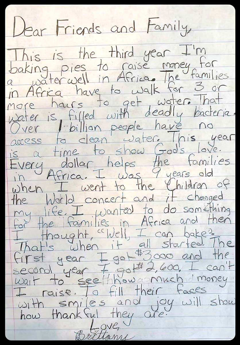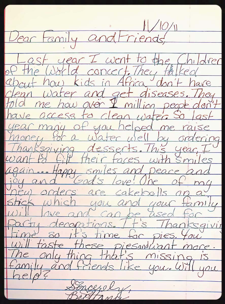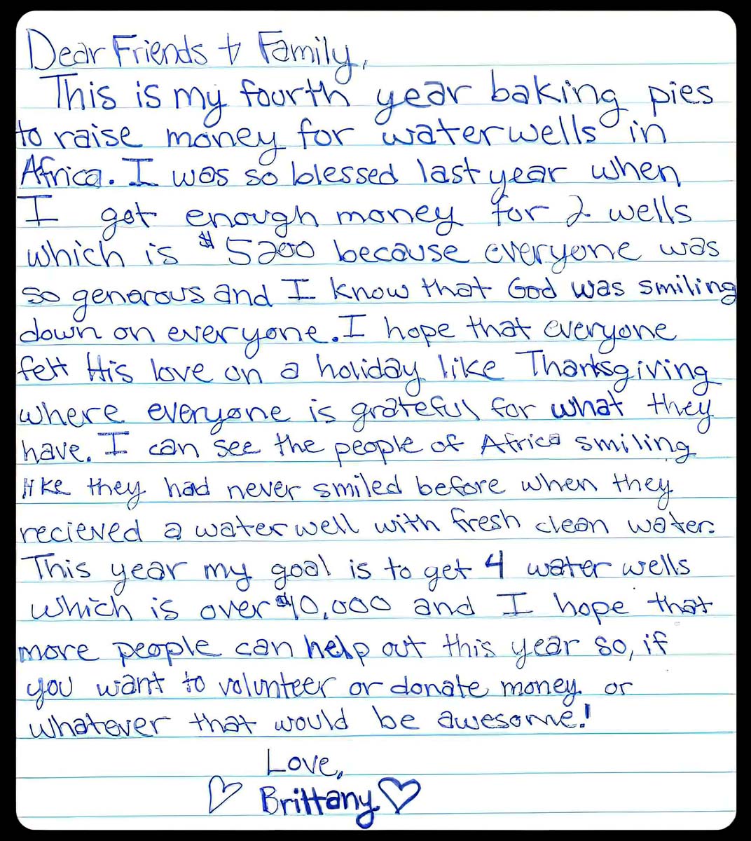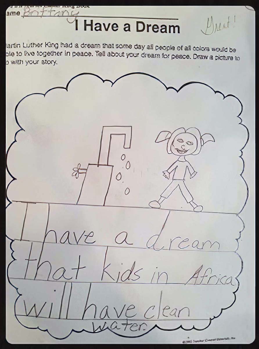 Shortly after that, her 3rd-grade teacher taught the students about Martin Luther King Jr.’s “I Have a Dream” speech and asked them to write down their own dream. Brittany wrote: “I have a dream that kids in Africa will have clean water.”
