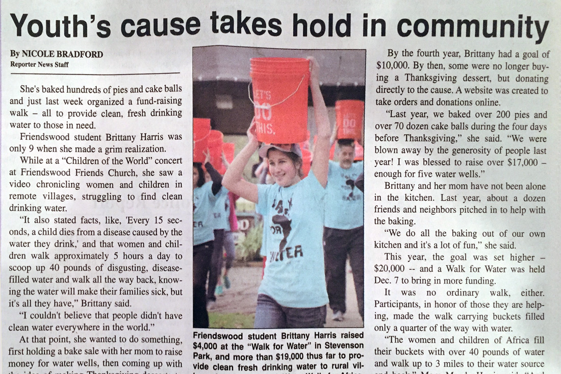 Water Wells for Africa is pleased to announce that Brittany Harris (age 13) of Friendswood, TX is this year’s recipient of the “WWFA Hero of the Year” award.